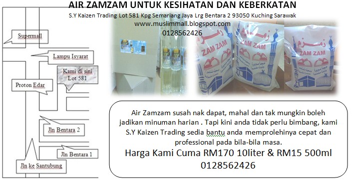 Semua persoalan ini dapat diselesaikan kerana kami di SY Kaizen Trading sedia bantu anda semua untuk menikmati air zamzam pada bila-bila masa sekalipun bukan bulan puasa yang penting anda mahu di mana sahaja di Malaysia dari Perlis sehingga ke Sabah. Kami sedia hantar dengan kos perkhidmatan yang sangat berpatutan. Kami boleh kirim ke tempat anda asal anda mahu tanggung kosnya sahaja. Harga Semenanjung RM150 dan harga Sarawak RM170 dan botol 500ml RM15 Sarawak dan RM12 Semenanjung. Cepat siapa cepat dia dapat jumlah sangat terhad. Telefon sekarang 0128562426/ airzamzam1.blogspot.com